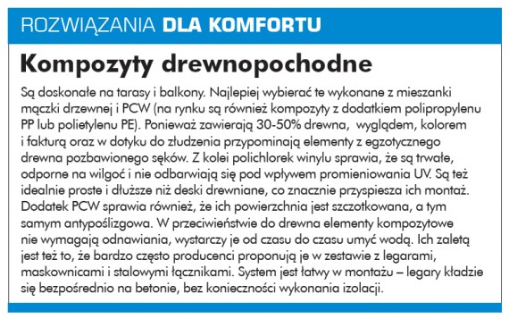 Elementy drewniane. Stosuje się je na tarasach i balkonach, także tych niezadaszonych. W takiej roli doskonale sprawdzi się drewno egzotyczne oraz krajowe termodrewno, czyli gatunki rosnące w Polsce przetworzone termicznie.To produkt o zwiększonej odporności na wilgoć, korozję biologiczną oraz promieniowanie UV. Drewniane deski tarasowe mogą mieć różne przekroje, np. 19x90, 21x120 czy 45x145 mm. Poza deskami tarasowymi na balkonach czy tarasach na drugiej kondygnacji chętnie stosuje się gotowe panele modułowe o różnych kształtach i wymiarach, które za pomocą umieszczonych na nich zaczepów można szybko zamontować na nośnej kratce. Ze względu na bezpieczeństwo użytkowników najlepiej stosować elementy ryflowane, czyli z rowkami wyżłobionymi wzdłuż deski – są antypoślizgowe. Gatunki przeznaczone do układania w tych miejscach muszą być twarde, o niskim współczynniku skurczu – warunek ten najpiej spełnia drewno egzotyczne: afromosia, badi, bangkirai, cumaru, grapia, ipe, massaranduba.